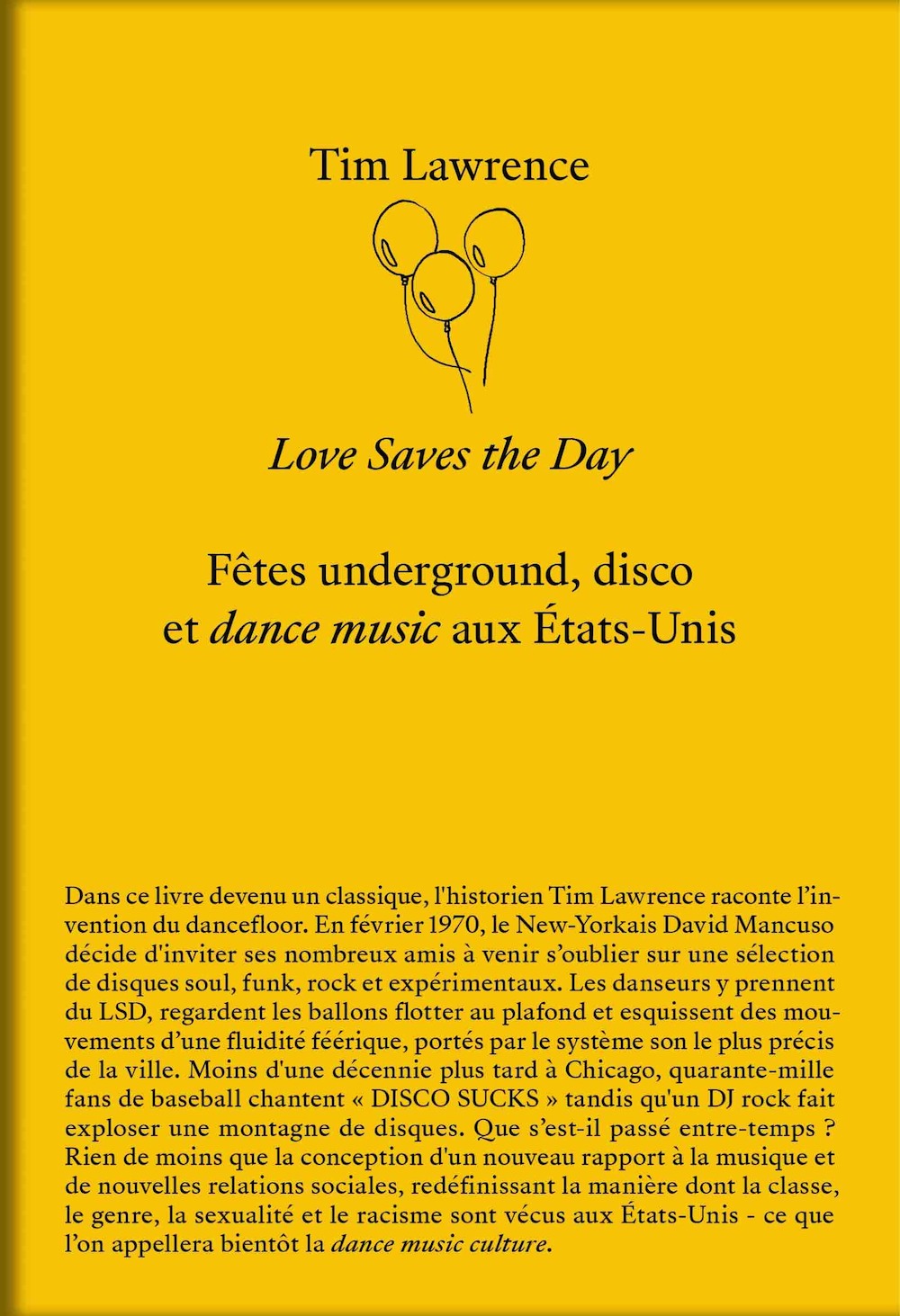 Avec Love Saves the Day, l'historien britannique Tim Lawrence raconte l'histoire définitive de la culture dance music états-unienne des années 1970, de ses racines souterraines à NoHo et Hell's Kitchen à son épanouissement tapageur dans le centre de Manhattan, en passant par sa transmission à travers les banlieues américaines et les hauts lieux urbains tels que Chicago, Boston, San Francisco, Los Angeles, Newark et Miami. Entre virées nocturnes, musique radicale et sexualité polymorphe, c'est une plongée d'une précision hallucinante dans les techniques de mix des DJ de l'époque, l'architecture des salles et les disques les plus excentriques, aux sources des conceptions contemporaines du dancefloor.