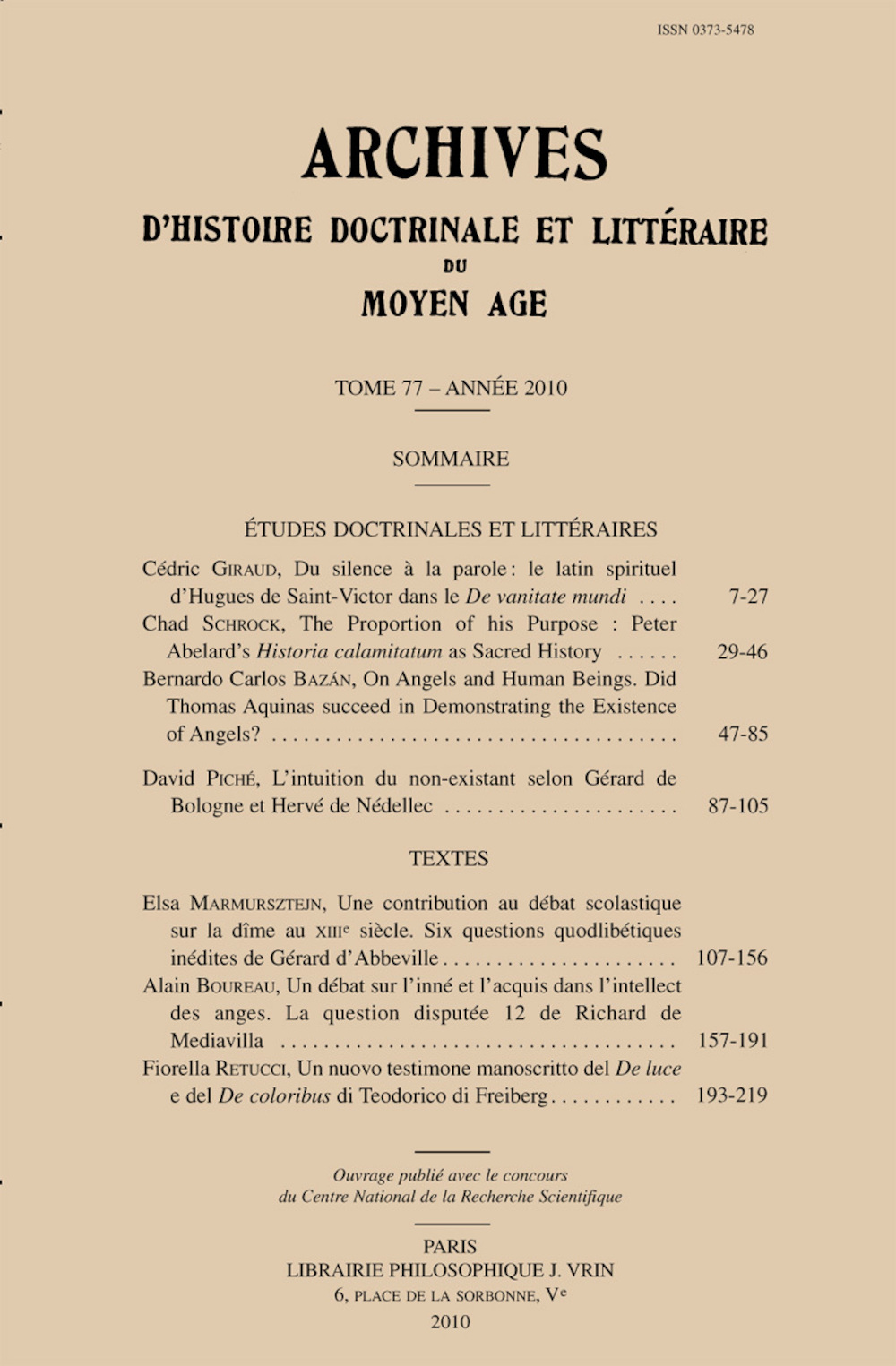 Archives d'histoire litteraire et doctrinale du Moyen-Age, t. 77, 2010