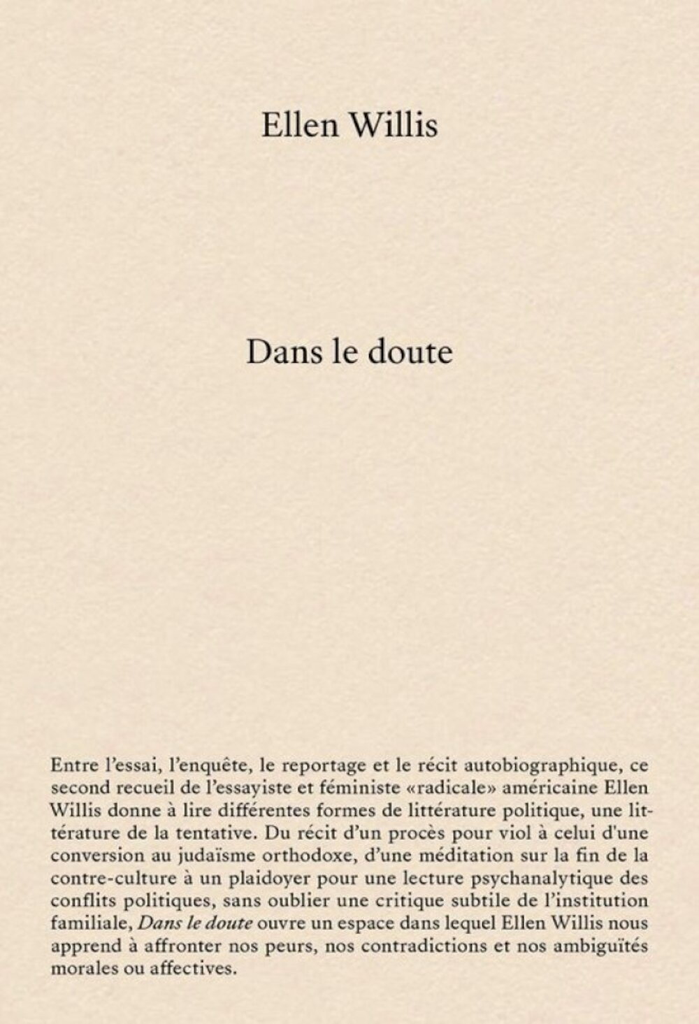 Entre l'essai, l'enquête, le reportage et le récit autobiographique, ce second recueil de l'essayiste et féministe radicale américaine Ellen Willis donne à lire différentes formes de littérature politique, une littérature de la tentative. Du récit d'un procès pour viol à une méditation sur la fin de la contre-culture, d'un plaidoyer pour une lecture psychanalytique des conflits politiques à une réflexion sur l'attrait de la spiritualité, sans oublier une critique subtile de l'institution familiale, Dans le doute ouvre un espace dans lequel Ellen Willis nous apprend à affronter nos peurs, nos contradictions et nos ambiguïtés morales ou affectives.