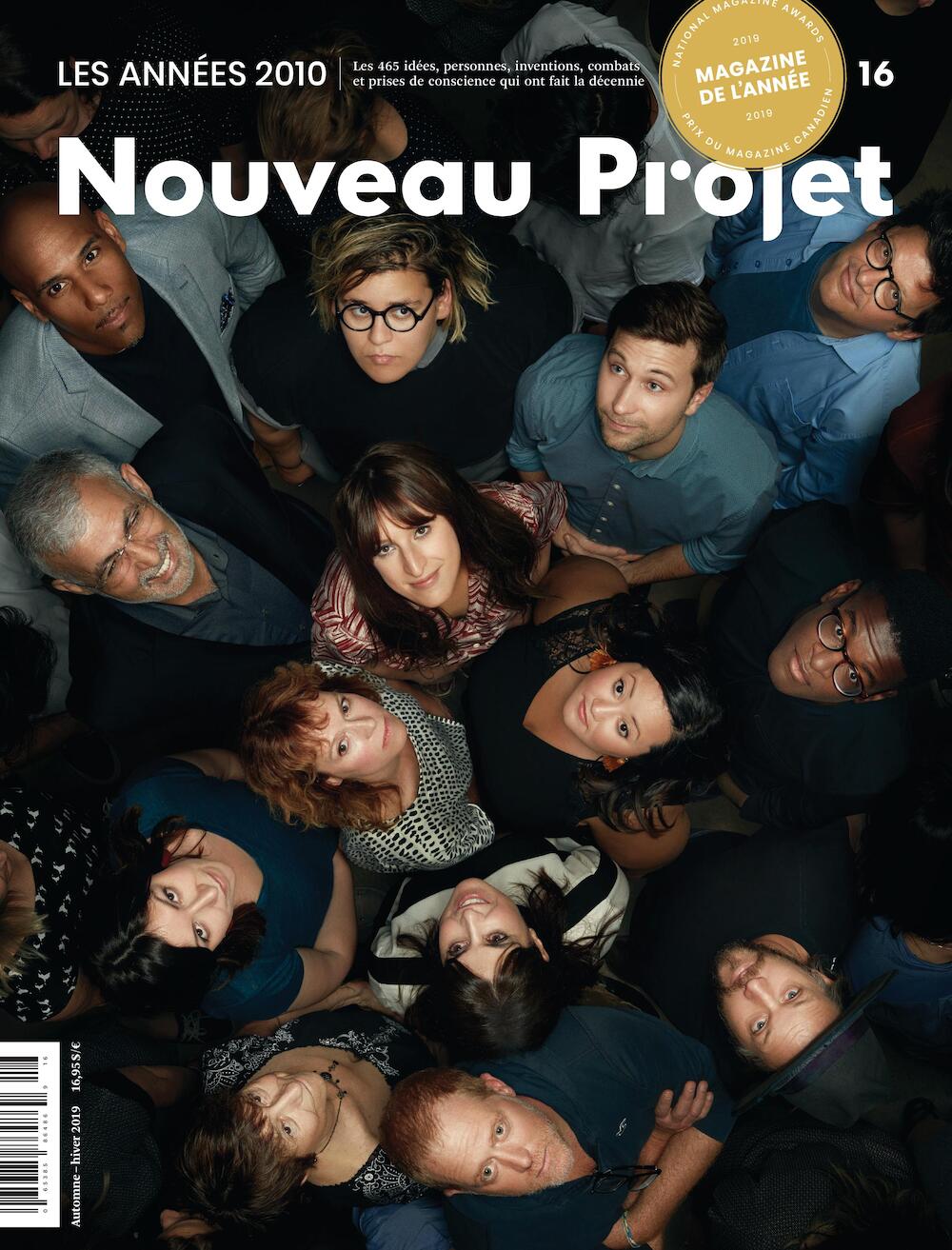 La décennie 2010 se terminera en décembre. Pour l’occasion, Nouveau Projet a souhaité s’arrêter un instant sur ces dix années que nous venons de traverser. Quels droits individuels et collectifs avons-nous revendiqués? Quelles crises nationales et internationales avons-nous affrontées? Quels artistes, politiciens, activistes et vedettes ont pris la parole? Quels nouveaux mots, gadgets et accessoires avons-nous manipulés? Ce numéro d’automne-hiver présente un dossier protéiforme, riche et éclaté en 465 idées, personnes, inventions, combats et prises de conscience qui ont fait les années 2010. Outre ce dossier, ce numéro aborde un florilège de sujets, allant de la dépression, au besoin de mieux communiquer, en passant par l’histoire des garderies, un tour d’horizon des territoires autochtones, un portrait de l’écrivain-philosophe Jean Bédard, un de la présidente sortante de Médecins Sans Frontières Joanne Liu, un essai sur Rosa Luxemburg, les recommandations culturelles de l’équipe et doit-on vraiment travailler autant?