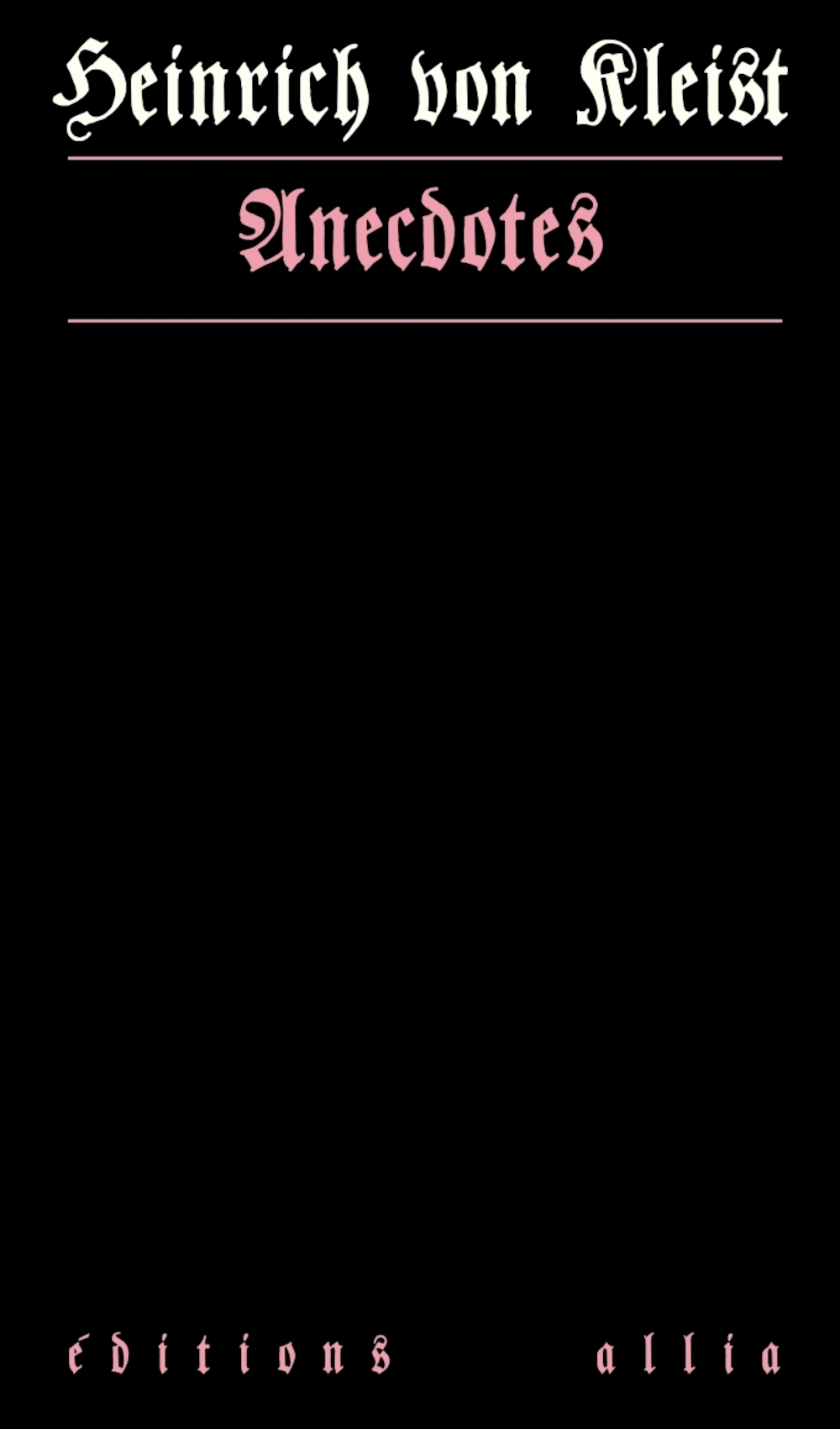 Parmi les quelque 150 textes écrits par von Kleist en 153 numéros, 34 ont reçu le nom d’Anecdotes. Certains parlent d’“histoires courtes”, de “curiosités”. Fantasques ou caustiques, transgressives voire offensives, la force de ces proses fait de ce recueil une œuvre à part entière.