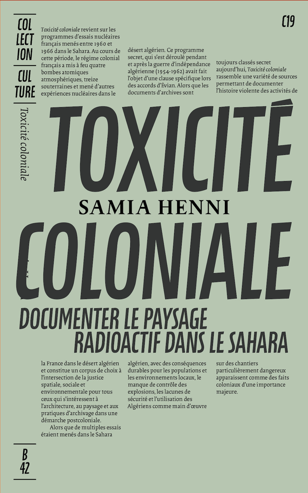 Toxicité coloniale revient sur les programmes d’essais nucléaires français menés entre 1960 et 1966 dans le Sahara algérien. Ce programme secret, qui s’est déroulé pendant et après la guerre d’indépendance algérienne (1954-1962), a permis au régime colonial français de mettre à feu quatre bombes atomiques atmosphériques, treize souterraines et mené d’autres expériences nucléaires dans le désert. Alors que la grande majorité des documents d’archives sont toujours classés secret aujourd’hui, Toxicité coloniale rassemble une variété de sources permettant de documenter l’histoire violente des activités de la France en Algérie. Le livre constitue un corpus de choix à l’intersection de la justice spatiale, sociale et environnementale pour ceux et celles qui s’intéressent à l’architecture, au paysage et aux pratiques d’archivage dans une démarche postcoloniale.