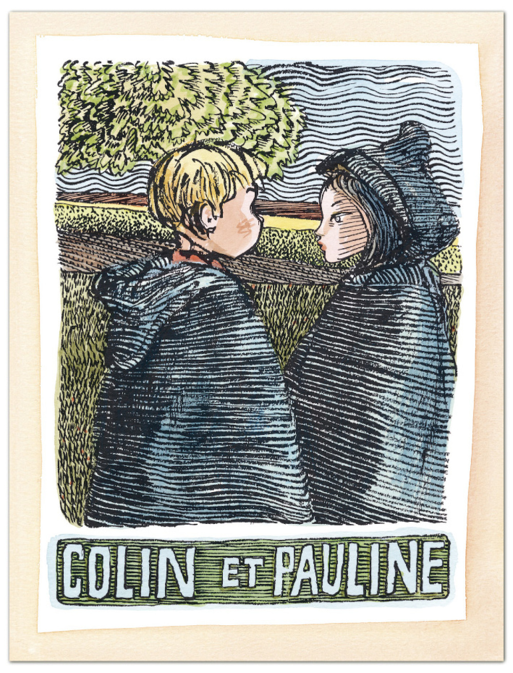 Main dans la main sous leur pèlerine, Pauline et Colin grimpent la colline. Croquent des raisins et de la résine, suivent le lapin jusqu'à la sapine. Parmi le crottin, le corbeau clopine vers un marcassin cassant des racines.