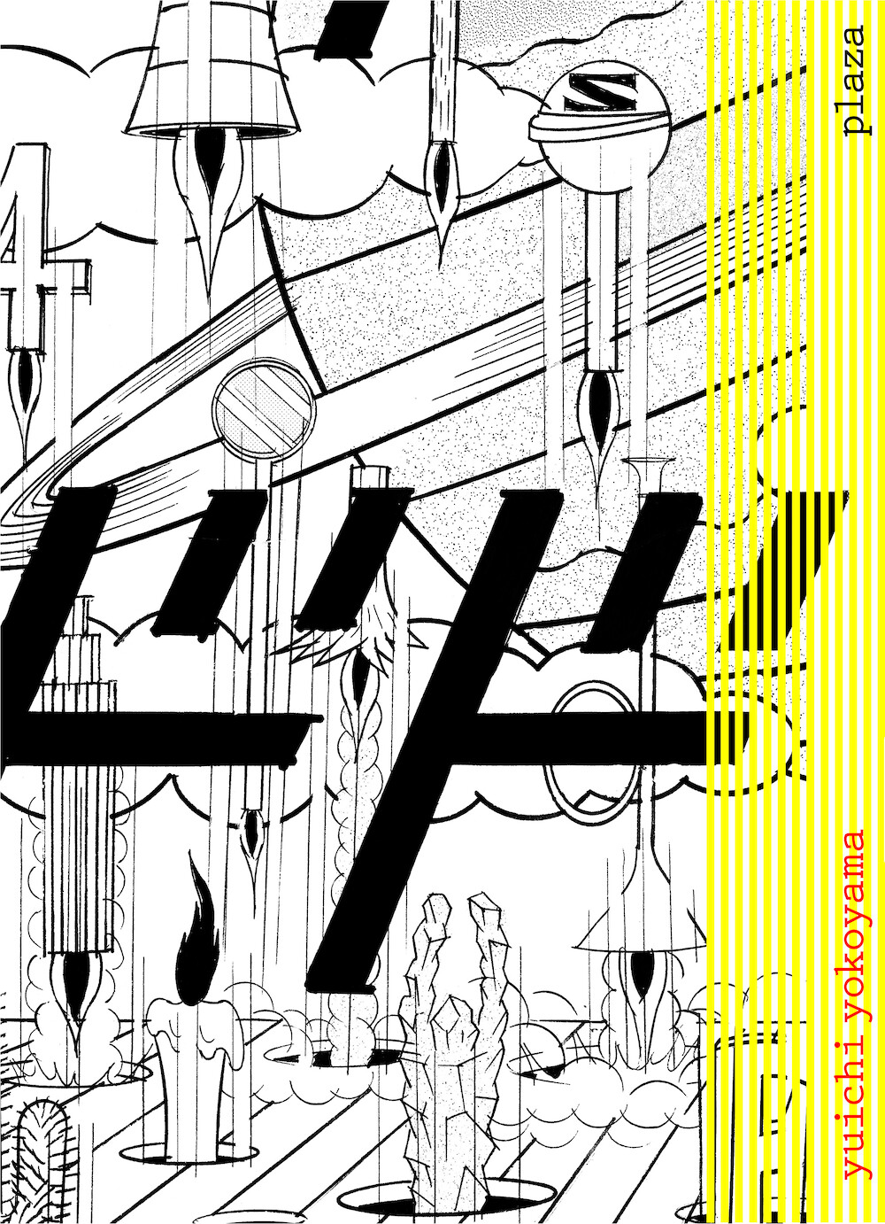 Plaza est un défilé de carnaval frénétique qui n’offre aucun moment de répit, qui jamais ne trahit aucune baisse de régime : sur une sorte de tapis roulant qui fait office de scène défilent de gauche à droite, a contrario du sens de lecture, les objets les plus hétéroclites, les assemblages et les acrobaties les plus grotesques, tandis que le public en contrebas, régulièrement rudoyé et même agressé physiquement, manifeste une ferveur croissante, une excitation qui confine à l’extase mystique. Plaza est une fête dyonisiaque mécanique, un spectacle grandiose qui célèbre pêle-mêle les origines de l’univers, l’animisme, les dieux, les objets manufacturés, le dévouement, la célébration elle-même, le totalitarisme et la quatrième dimension. Plaza est une fantasmagorie visuelle à demi dissimulée derrière les lourdes onomatopées qu’engendrent son tumulte. Plaza est une cérémonie dédiée au mouvement, à la dynamique des formes et à la fantaisie, au chaos et à la création. Plaza est un nouveau et joyeux manifeste de Yokoyama en faveur d’une bande dessinée libre.