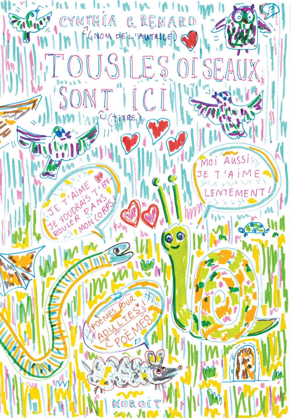 Dans Tous les oiseaux sont ici, Cynthia G. Renard se promène dans la forêt tatouée de son enfance avec un corps femelle en constante métamorphose. C’est la nuit, le monde est incertain et chaotique, elle s’envole dans un univers de rêve où des personnes animales de plumes, de fourrure et d’écailles l’accueillent, où les arbres lui parlent et la réconfortent. Les frontières n’existent plus entre elle et le monde, elle est le papillon, le scintillement de l’étoile et les quenouilles.