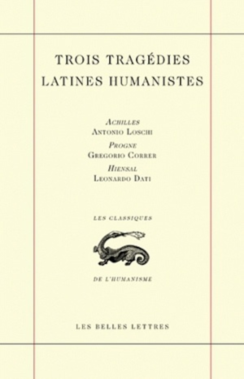 Ce volume réunit les trois tragédies, intégralement conservées, composées après l'Ecerinis d’Albertino Mussato (1315). Antonio Loschi, Gregorio Correr et Leonardo Dati partagent la même conception du tragique héritée de Sénèque (1-65). Les crimes de la Guerre Civile de Lucain (39-65) et des Tragédies de Sénèque avaient déjà inspiré Albertino Mussato. Pour bâtir sa tragédie sur la mort d’Achille (Achilles, vers 1390), Antonio Loschi continue de s’inspirer des tragédies sénéquiennes, mais il renouvelle son inspiration en multipliant les emprunts à d’autres modèles, de l’Antiquité, du Moyen Âge et du premier humanisme italien. Gregorio Correr emprunte au livre VI des Métamorphoses d’Ovide (43 av. J.-C.-18 ap. J.-C.), mais aussi à Sénèque et à Boccace (1315-1375), un nouveau modèle d’horreur tragique pour composer sa Progne en 1426-1427. Enfin Leonardo Dati, entre 1440 et 1442, reprend à la Guerre de Jugurtha de Salluste (86-34) l’épisode de l’assassinat d’Hiempsal pour composer la tragédie qui porte le nom de ce héros (Hiensal). Dans ces trois tragédies, des femmes commettent un sacrilège pire que ceux commis par des princes sanguinaires. Hécube ourdit la mort d’Achille en attirant celui-ci dans un guet-apens (dans l’Achilles d’Antonio Loschi) ; Procné immole son fils et le sert en guise de dîner à son époux, le roi de Thrace Térée, père de l’enfant (dans Progne de Gregorio Correr) ; Inuidia, allégorie de l’Envie, attise la haine entre les héritiers du royaume de Numidie pour obtenir la mort d’Hiempsal (dans Hiensal de Leonardo Dati).