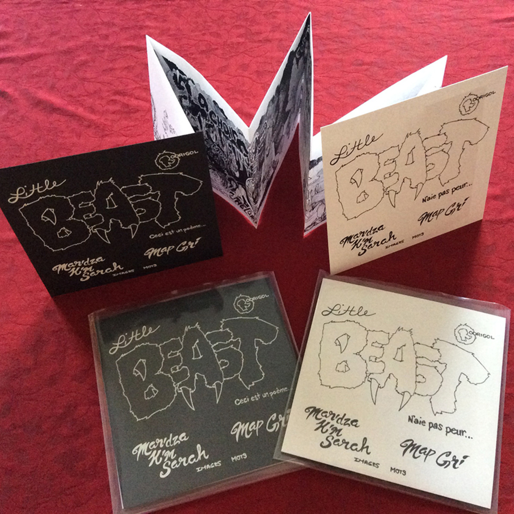 Little Beast est née de la rencontre de la poésie de Map Gri et des dessins de Maridza Kim Sarah. Les mots sont imbriqués aux dessins et forment du même souffle un territoire fantasmagorique sensible, dangereux, d'une féminité brute résolument assumée. Sous forme de livre accordéon, Little Beast est un singulier objet imprimé, sérigraphié et assemblé à la main.