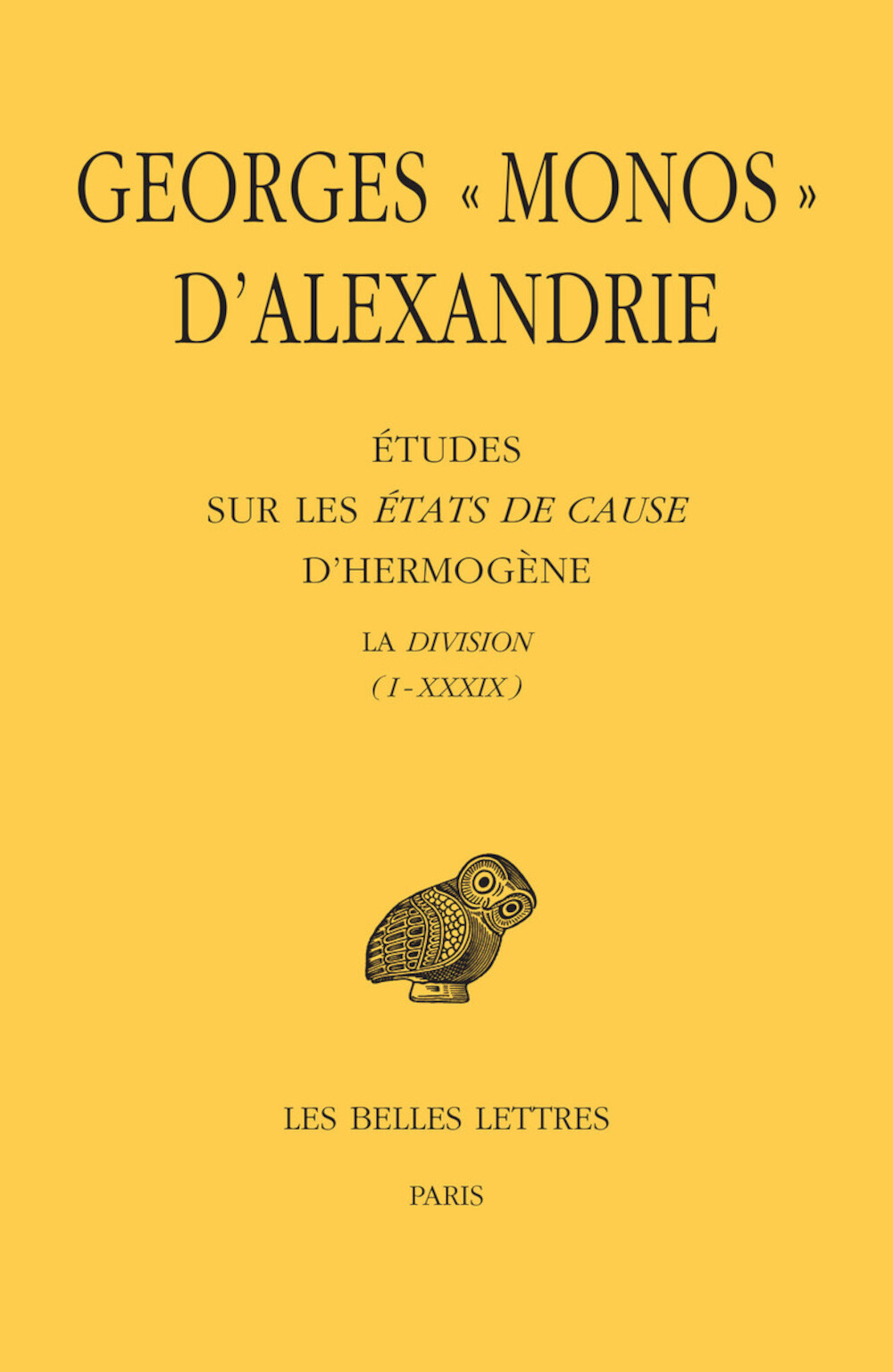 Ce qui d’abord retient l’attention au sujet de la publication de l’ouvrage de Georges d’Alexandrie (alias Monos), Scolies sur les États de cause d’Hermogène. La Division, c’est sa nouveauté. Il s’agit en effet d’une editio princeps. C’est aussi son importance : le texte occupe la totalité des deux gros codices qui nous l’ont transmis (environ 700 p. Budé).