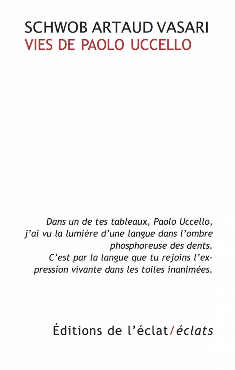 L’œuvre et la vie du peintre florentin Paolo Uccello (1397-1475) sont aussi intimement imbriquées que les jambes des chevaux et des hommes dans ses célèbres tableaux de bataille, et Giorgio Vasari lui consacre déjà une « vie imaginaire » qui servira de modèle à celle de Marcel Schwob (1896), laquelle inspirera ensuite deux textes à Antonin Artaud. Nous avons rassemblé ici ces trois vies d’Uccello, par Vasari, Schwob et Artaud, qui ponctuent la destinée de ce peintre hors du commun. Elles font revivre sous nos yeux ce moment secret de la création artistique qui échappe aux études d’histoire de l’art et qui ne se montre qu’à l’imagination créatrice la plus inspirée.