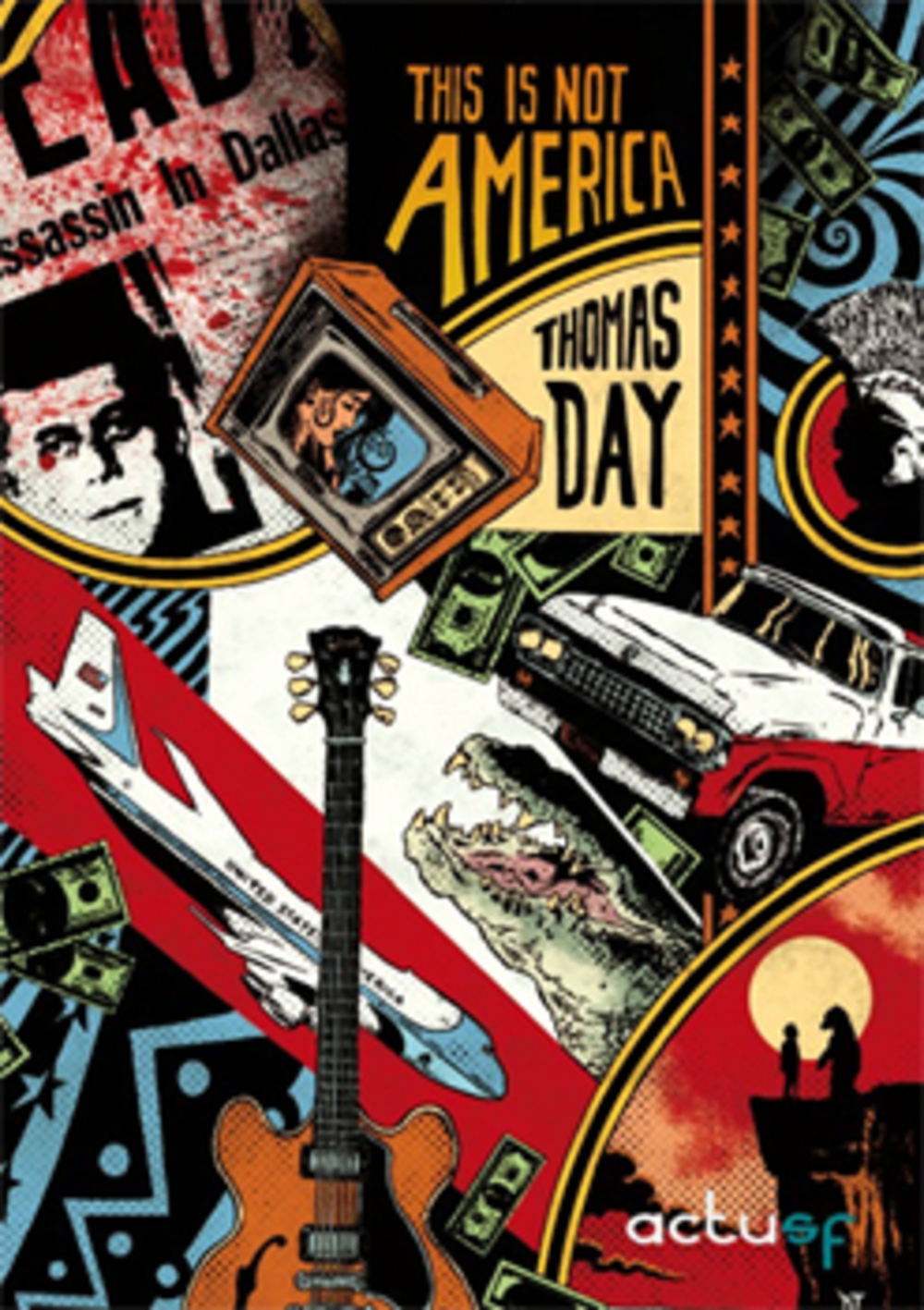 L’Amérique de Thomas Day, où frayent dans un carambolage d’influences, le carton pâte fané d’une puissance passée, le road sign rouillé – moitié ensablé – qui indique le chemin de la Zone 51, le cool déjanté d’un Tarantino sous crack et l’ombre, découpée dans la lumière du couchant sur John Ford’s Point, de ce héros américain – la mâchoire carrée et le zygomatique en berne – qui regarde loin, vers l’horizon et la Frontière.